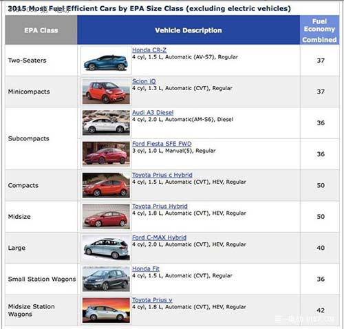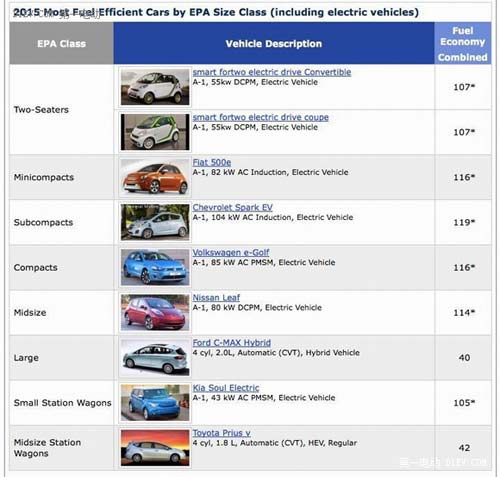 最近,EPA公布了2015年度能效最高的車型榜,毫無懸念,這個榜單基本上被電動車所壟斷,一共8個級別9個冠軍車型中,6個是電動車,另兩個是混合動力車(詳見上圖)。