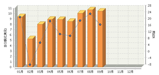 根據海關總署公布的數據,2014年1~9月,全國電池行業累計完成出口額80.21億美元,同比增長15.22%。其中,9月份完成出口額10.45億美元,同比增長17.95%。2014年全國電池行業月度出口額及同比數據如上圖所示。