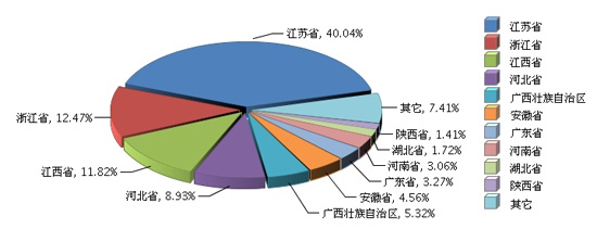 根據(jù)國(guó)家統(tǒng)計(jì)局公布數(shù)據(jù),全國(guó)太陽能電池行業(yè)累計(jì)完成產(chǎn)量3,382.47萬千瓦,同比增長(zhǎng)27.30%。比重主要集中在江蘇、浙江、江西、河北、廣西、安徽地區(qū)。其中:江蘇省完成累計(jì)產(chǎn)量1354.47萬千瓦(占40.04%),同比增長(zhǎng)28.29%;浙江省完成累計(jì)產(chǎn)量421.87萬千瓦(占12.47%),同比增長(zhǎng)30.25%;江西省完成累計(jì)產(chǎn)量399.77萬千瓦(占11.82%),同比增長(zhǎng)-6.32%;河北省完成累計(jì)產(chǎn)量301.98萬千瓦(占8.93%),同比增長(zhǎng)21.17%;廣西壯族自治區(qū)完成累計(jì)產(chǎn)量179.8萬千瓦(占5.32%),同比增長(zhǎng)88.43%;安徽省完成累計(jì)產(chǎn)量154.34萬千瓦(占4.56%),同比增長(zhǎng)178.12%。