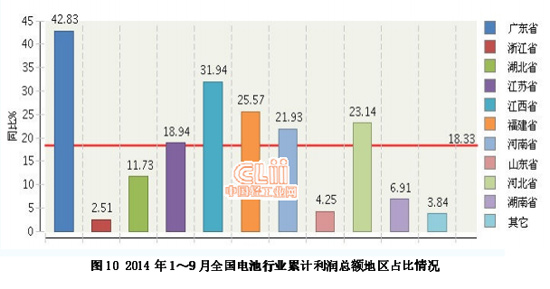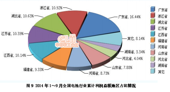 2014年1~9月全國電池行業(yè)利潤較高的產(chǎn)區(qū)主要集中在廣東、浙江、湖北、江蘇、江西、福建、河南、山東、河北、湖南地區(qū),10個地區(qū)完成利潤總額占全國的91.86%。(參見圖9)
