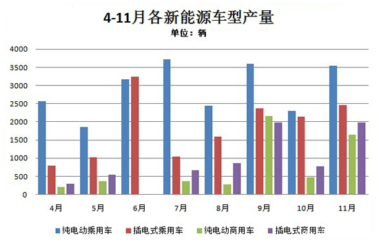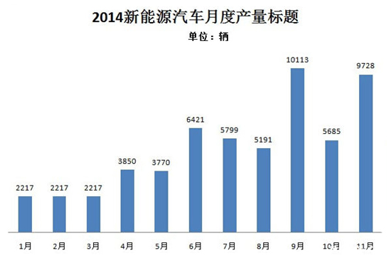 2014年1-11月,新能源汽車累計生產5.67萬輛,同比增長5倍。其中,純電動乘用車生產2.58萬輛,同比增長近7倍,插電式混合動力乘用車生產1.36萬輛,同比增長近25倍,燃料電池乘用車生產6輛;純電動商用車生產7363輛,同比增長188%,插電式混合動力商用車生產9949輛,同比增長245%。
