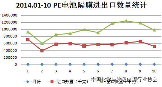 2014年10月,我國進口乙烯聚合物制電池隔膜共511755千克,進口額為3314萬美元,出口數量為471587千克,出口額為226萬美元。本年度至10月累計進口乙烯聚合物制電池隔膜量為5683565千克,累計進口額為30250萬美元。累計出口乙烯聚合物制電池隔膜量為4075074千克,累計出口額為2799萬美元。