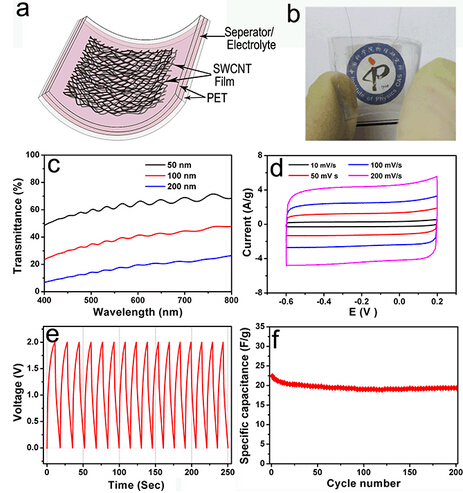 圖2 (a)透明超級電容器結構示意圖及(b)光學照片;(c)不同厚度碳納米管薄膜組裝的超級電容器的透光率,柔性透明碳納米管薄膜超級電容器(50 nm)(d)不同掃描速率下的CV曲線;(e)恒電流充放電曲線;(f)比電容隨充放電次數的變化。