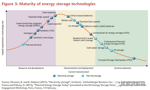 3、各類儲能技術的技術成熟度,左邊是研發階段,中間是示范應用階段,右邊是商業化應用階段。