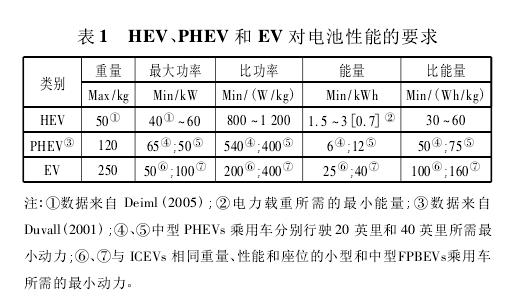 由于不同類型新能源汽車中,車用動力電池的使用方式有較大區別,因此對于其性能要求有較大區別。HEV有汽油發動機作為動力來源,更強調加速性能和爬坡能力,因此更注重電池的比功率(要求高達800一1 200 W / kg);PHEV和EV完全以電池作為動力,更強調充電后的續駛能力,因而更關注電池的比能量(要求達到100一160 Wh/kg)(見表1)。