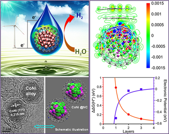 近日,中國科學(xué)院大連化學(xué)物理研究所催化基礎(chǔ)國家重點實驗室副研究員鄧德會和中科院院士包信和帶領(lǐng)的研究團(tuán)隊在長期深入研究納米碳材料催化的基礎(chǔ)上,通過創(chuàng)新二維納米碳材料(類石墨烯材料)的制備策略和合成方法,成功實現(xiàn)了均一的超薄石墨烯殼層(一般為1-3碳層)對3d過渡金屬納米粒子的包裹和封裝。理論模擬和實驗研究表明,在催化反應(yīng)過程中,活性金屬納米粒子催化劑在納米碳空腔中的封裝阻斷了其與苛刻反應(yīng)環(huán)境(如酸性、堿性和強氧化性等)的直接接觸,有效地延緩和阻止了催化劑的失活,同時,被包裹的納米金屬的活性價電子通過與類石墨烯碳層的相互作用“穿透(penetration)”到外表面,實現(xiàn)了高效催化反應(yīng)。基于這一原理制備得到的石墨烯碳層封裝的納米鈷-鎳催化劑應(yīng)用于強酸性條件下電解水制氫反應(yīng)(HER),表現(xiàn)出了優(yōu)異的催化活性和穩(wěn)定性,在電流密度為10 mA/cm2 的條件下,電解水陰極過電位僅為142 mV,性能接近于通常采用的40%Pt/C催化劑,相關(guān)結(jié)果于近日在《德國應(yīng)用化學(xué)》(Angew. Chem. Int. Ed., 2015, DOI: 10.1002/anie.201409524)在線發(fā)表,并被該期刊選為“熱點文章(Hot Paper)”。
