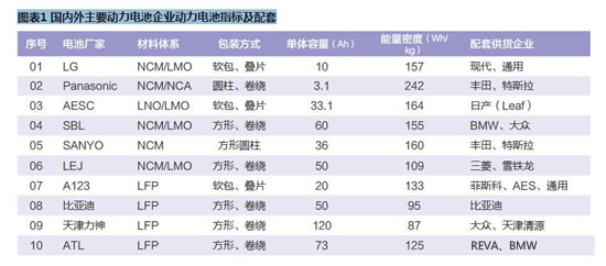 目前量產(chǎn)的鋰離子動力電池產(chǎn)品能量密度普遍偏低。國外以日本、韓國的企業(yè)為例,普遍采用層狀鎳鈷錳三元+尖晶石錳酸鋰體系正極材料,單體電池能量密度約160Wh/kg;而國內(nèi)普遍采用橄欖石型磷酸鐵鋰為正極材料,單體電池能量密度不超過140Wh/kg。動力電池能量密度偏低問題制約了電動汽車的行駛里程,直接阻礙了純電動汽車的市場推廣。國內(nèi)外主要動力電池企業(yè)已經(jīng)量產(chǎn)能量型動力電池產(chǎn)品關(guān)鍵指標(biāo)及配套供貨企業(yè)如下:
