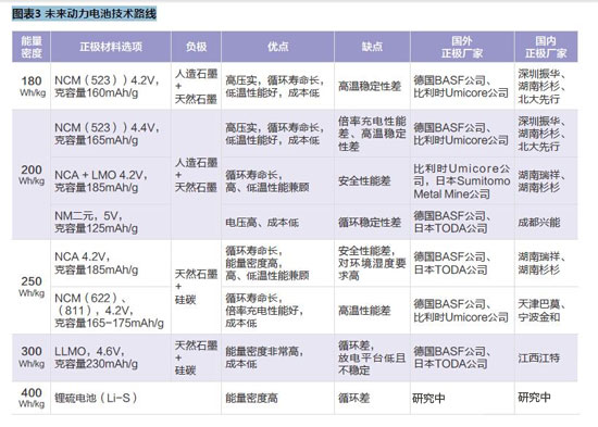 根據(jù)2011年NEDO公布消息,日本政府已集合多所大學(xué)及企業(yè)進(jìn)行高能量密度電池的研究,計(jì)劃到2020年達(dá)到250Wh/kg(可支持電動車行駛300 公里),2030年達(dá)到500Wh/kg(可替代傳統(tǒng)燃油汽車的水平)。當(dāng)前,我國較好的磷酸鐵鋰電池能量密度可以達(dá)到 130Wh/kg,能夠支持行駛130公里。高比能正、負(fù)極材料開發(fā)是未來動力電池比能量大幅度提升的主要途徑。我國部分電池企業(yè)正進(jìn)行下一代電池的研發(fā),采用三元材料與改性錳酸鋰等,預(yù)計(jì)2015年上半年量產(chǎn)動力電池能量密度可達(dá)180Wh/kg,不額外增加電池?cái)?shù)量情況下可支持續(xù)駛里程達(dá)到200公里。技術(shù)路線上,按照未來動力電池的能量密度高低來劃分,可分為以下幾類。