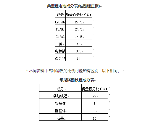 電池中有多種重金屬污染物,但是這些污染物大多都有經(jīng)濟(jì)價(jià)值。目前常用的鋰離子電池正極材料有 LiCoO2,LiNiO2,LiMn2O4,LiFePO4和三元材料等,正極材料、乙炔黑導(dǎo)電劑與有機(jī)粘合劑涂覆于鋁箔上構(gòu)成正極,負(fù)極主要是由片狀碳材料、無(wú)定形碳材料涂覆于銅箔上構(gòu)成。電解質(zhì)溶液中的電解質(zhì)鹽一般為 LiCF3SO3,LiBF4和LiPF6等鋰鹽,常用的溶劑有碳酸乙烯脂(EC)、碳酸丙稀脂(PC)、碳酸二甲脂(DMC),甲基乙基碳酸酯(EMC)等。