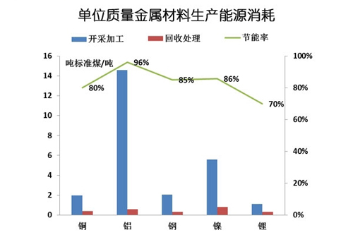 電池回收,應該從電池的全生命周期去考慮問題。比如電池的生產需要追溯到原材料的生產。電池原材料以有色金屬為主,我國有色金屬工業的能源消耗水平與國際先進水平存在明顯的差距,能源消耗主要集中在礦山、冶煉和加工三大領域,有色金屬中電解鋁的能耗最高,是有色金屬工業耗能大戶之一。但是有色金屬回收過程的能源消耗遠遠小于原生金屬,下圖所示為原生金屬與再生金屬材料生產的能耗差異,由圖可知,金屬進行回收再利用的節能率在70%-90%之間。其中金屬鋁回收節能效率最高,在90%以上。如果使用電池回收原材料生產電池,在節能減排方面是有絕對的優勢的。