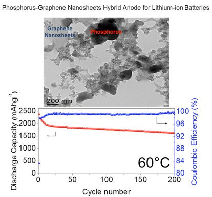 針對(duì)這一問(wèn)題,最近美國(guó)賓夕法尼亞州立大學(xué)(The Pennsylvania State University)王東海教授領(lǐng)導(dǎo)的,以于昭新、宋江選為主的科研梯隊(duì)發(fā)明了一種新型鋰離子電池負(fù)極材料:“紅磷-石墨烯”納米復(fù)合材料。該種材料是由紅磷和石墨經(jīng)球磨制備得到。紅磷化學(xué)穩(wěn)定性高,廉價(jià)易得,而且對(duì)環(huán)境污染小。其作為鋰離子電池負(fù)極材料的理論容量可達(dá)2600 mAh/g,是商用石墨電極的7倍。 石墨/石墨烯因其極高的電子電導(dǎo)率被引入到該體系中以提升納米復(fù)合材料整體的電子電導(dǎo)率。在高速球磨過(guò)程中,微米級(jí)的紅磷顆粒被打碎至納米級(jí)。石墨在球磨 過(guò)程中剝離為大比表面積的石墨烯。經(jīng)過(guò)長(zhǎng)時(shí)間機(jī)械力作用,石墨烯相互搭接形成一個(gè)緊密結(jié)合的三維導(dǎo)電網(wǎng)絡(luò),而納米級(jí)紅磷顆粒均勻分散在該網(wǎng)絡(luò)中。紅外光譜 (Infrared Spectroscopy)測(cè)試顯示,紅磷和石墨烯以“磷-氧-碳 (P-O-C)”的化學(xué)鍵形式結(jié)合在一起,這又為該材料出眾的電池性能提供了保證。在室溫下,該納米復(fù)合材料的放電容量可達(dá)1400mAh/g,4倍于現(xiàn)行商用化鋰離子電池負(fù)極材料——石墨。 經(jīng)過(guò)300周的循環(huán),放電容量仍然能保持在60%以上。高溫環(huán)境(60°C)對(duì)于現(xiàn)行商用鋰離子電池仍是很大的挑戰(zhàn)。而該種材料在60°C下,放電容量可進(jìn)一步提升至1650mAh/g。經(jīng)過(guò)200周循環(huán),放電容量保持率可在70%以上。