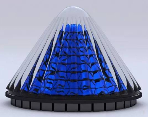 一個一米直徑大的錐形支架上,裝著幾百個三角形的光伏電池,包裹在一個“密封外透鏡聚光器”里面。光伏旋轉的動力來自少量的太陽能電力和磁懸浮系統,減少了噪音,也幾乎無需保養。