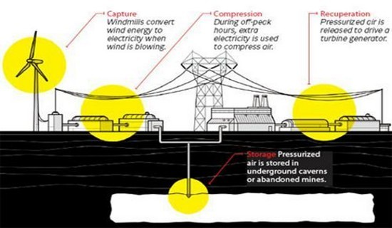 壓縮空氣儲能采用空氣作為能量的載體,大型的壓縮空氣儲能利用過剩電力將空氣壓縮并儲存在一個地下的結構(如地下洞穴),當需要時再將壓縮空氣與天然氣混合,燃燒膨脹以推動燃氣輪機發電。