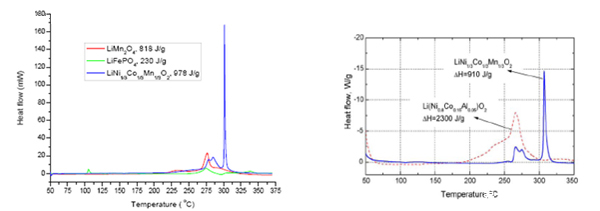 不同的正極材料,其活性物質(zhì)分解所產(chǎn)生的熱量是不同的,所釋放的氧氣含量也有所不同。磷酸鐵鋰正極材料由于分解時(shí)產(chǎn)生的熱量較少,因而在所有的正極材料中,熱穩(wěn)定性最為突出。鎳鈷錳三元材料分解時(shí)則會(huì)產(chǎn)生較多的熱量,同時(shí)伴有大量的氧氣釋放,容易產(chǎn)生燃燒或爆炸,因此安全性相對(duì)較低。