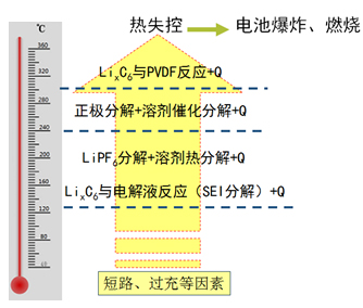 由于電池存儲(chǔ)能量,在能量釋放的過(guò)程中,當(dāng)電池?zé)崃慨a(chǎn)生和累積速度大于散熱速度時(shí),電池內(nèi)部溫度就會(huì)持續(xù)升高。鋰離子電池由高活性的正極材料和有機(jī)電解液組成,在受熱條件下非常容易發(fā)生劇烈的化學(xué)副反應(yīng),這種反應(yīng)將產(chǎn)生大量的熱,甚至導(dǎo)致的“熱失控”,是引發(fā)電池發(fā)生危險(xiǎn)事故的主要原因。