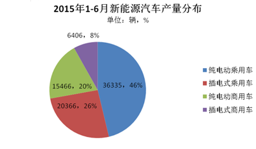 從車型分布來看,純電動(dòng)乘用車仍是整個(gè)新能源汽車市場的主力車型,2015年上半年生產(chǎn)36355輛,占總體產(chǎn)量的45%。其次是插電式乘用車生產(chǎn)20366輛,占比26%。新能源乘用車整體占比由去年的65%提升了7個(gè)百分點(diǎn),私人市場進(jìn)一步擴(kuò)大。