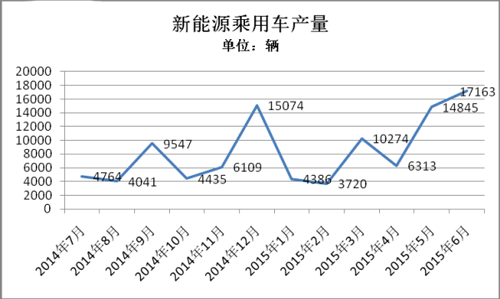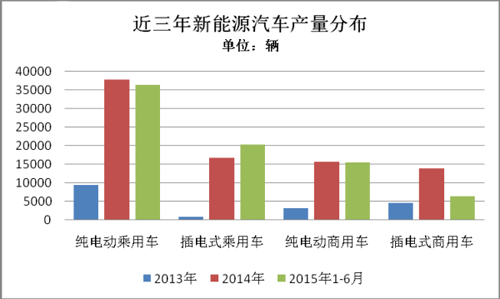 2015年1-6月,純電動(dòng)乘用車生產(chǎn)3.63萬輛,接近去年全年3.78萬輛的產(chǎn)量,同比增長3倍。
