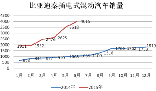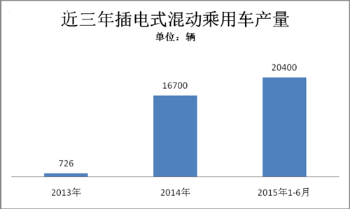 2015年1-6月,插電式混合動(dòng)力乘用車生產(chǎn)2.04萬輛,同比增長4倍。插電式乘用車在所有新能源車型中增長速度最快。