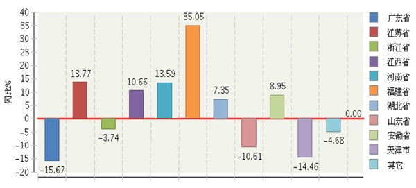 圖10 2015年1~5月全國電池行業累計主營業務收入主要地區同比增長情況