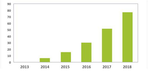 圖一、2014-2018年全球穿戴式裝置電池產值預測(單位:百萬美元)