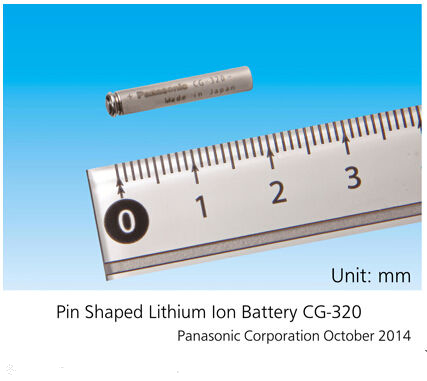 日本大廠松下(Panasonic)不僅是電動車動力鋰電池的主要供貨商,在3C鋰電池這塊當然不能缺席。Panasonic利用在信息及通訊裝置上所使用的電池材料技術,以及參考鈕扣型電池與其他小型鋰電池的制造技術,開發出 市場上最小的別針造型鋰離子電池CG-320,直徑只有3.5mm,高度約2公分,重約0.6公克,體積約是AAA電池的1/20,容量為13mAh。