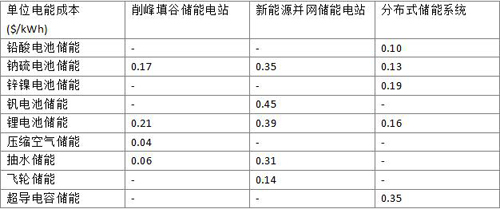 下表為各種儲能技術在各領域的單位電能成本比較: