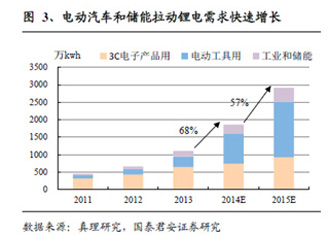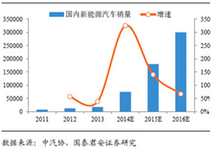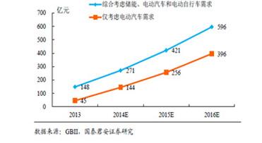新能源汽車的爆發(fā)性增長和儲能的需求,將為電動汽車的核心部件—動力鋰電池帶來巨大的市場空間。國泰君安證券預(yù)測,如再加上電動自行車和儲能的需求,2015-2016年中國動力鋰電市場規(guī)模將達人民幣421億和人民幣596億。