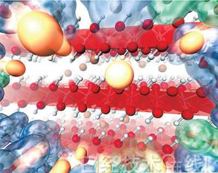 東京大學(xué)研究生院的山田淳夫教授等人開發(fā)的負(fù)極的示意圖。由鈦(紅)和碳(灰)組成的片狀物質(zhì)