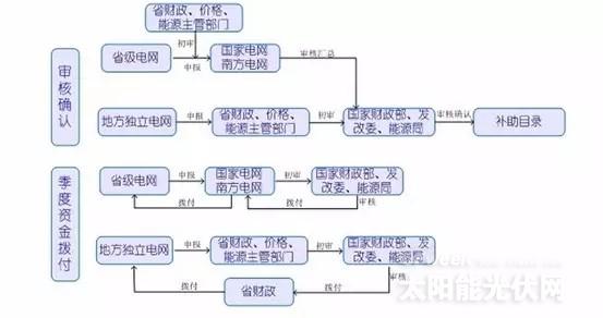 中央財政根據可再生能源電價附加收入及分布式光伏發電項目預計發電量,按季向國網、南網及地方獨立電網企業所在省級財政部門預撥補貼資金。電網企業根據項目發電量和國家確定的補貼標準,按電費結算周期及時支付補貼資金。