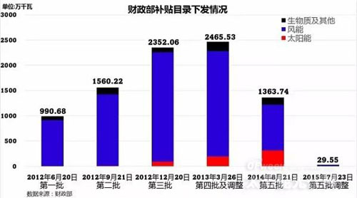 不多說直接上圖,這是最新的補助目錄發放情況,若不計2015年7月下發的第五批調整目錄,補助目錄已經1年沒有更新。從裝機容量來看,已列入目錄的太陽能及風能項目合計8118萬千瓦,然而截2015至6月末,太陽能及風能項目合計14069萬千瓦,意味著約有5000多萬千瓦的項目因沒有列入目錄而拿不到補貼。(全國并網風電裝機容量10491萬千瓦,全國光伏發電裝機容量3578萬千瓦,光伏電站3007萬千瓦,分布式光伏571萬千瓦。)
