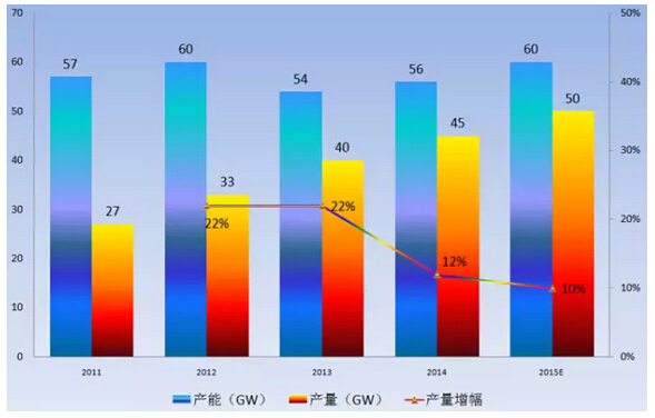 美國SPV Market Research預(yù)測,2015年,全球太陽能光伏組件的出貨量將達(dá)到49.7GW,相比2014年增長約25%;全球太陽能光伏組件產(chǎn)量將達(dá)到50GW,同比增長約10%;全球太陽能光伏組件的產(chǎn)能可以達(dá)到60GW,同比增長約7%。