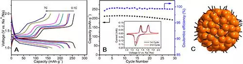 Na2C6H2O4/CNT納米多孔復合材料的倍率性能、循環性能及結構示意圖