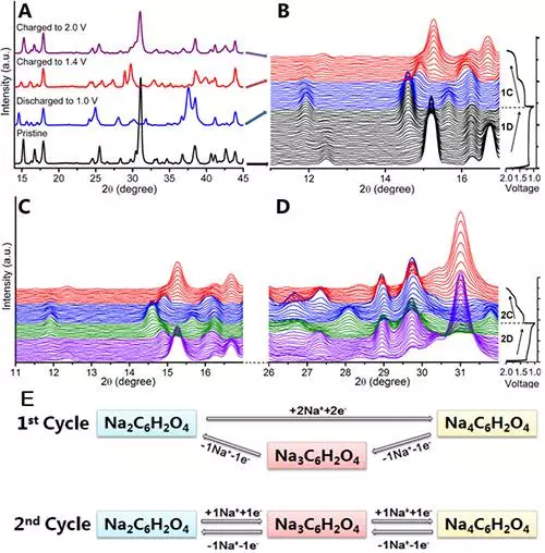 Na2C6H2O4前兩周嵌鈉過程的原位XRD圖譜及反應路徑示意圖