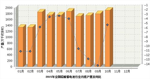 國家統計局最新公布的數據顯示,2015年9月中國鉛酸蓄電池產量為17,985,767.99千伏安時,同比下降13.72%。2015年1-9月止累計中國鉛酸蓄電池產量150,646,332.22千伏安時,同比下降10.47%。最新數據如下表所示: