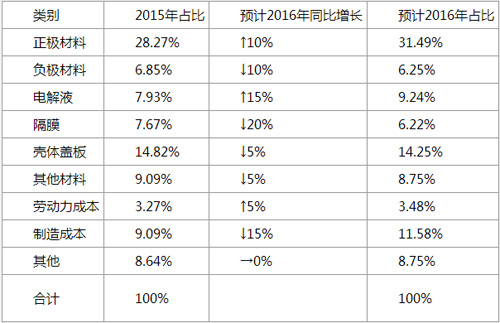 其他部分主要指資金使用成本和環保成本。目前電池企業大都在擴產,而企業的盈利能力根本不足以支撐這種擴張,因此,資金的使用成本很難下降,同時,在環境壓力越來越大的現實狀況下,環保成本毋庸置疑也不可能下降。這些成本2016年不上升就不錯。筆者這里預計保持2015年的水平。