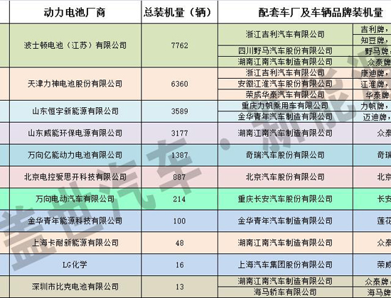 排在第三位的是山東恒宇新能源公司,其裝機量為3589輛,主要配套車廠是重慶力帆(裝機量為2785輛)和金華青年汽車(裝機量804輛)。
