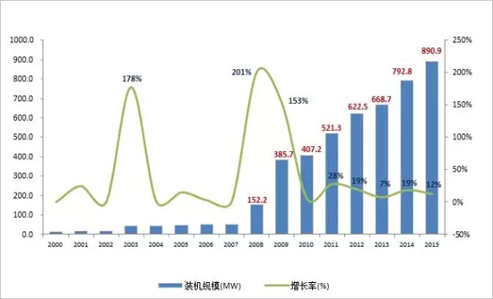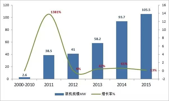 圖3:中國儲(chǔ)能項(xiàng)目累計(jì)裝機(jī)規(guī)模(2000-2015)