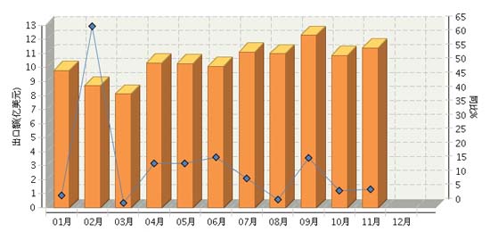 根據(jù)海關(guān)總署公布數(shù)據(jù), 2015年1~11月,全國電池行業(yè)累計完成出口額同比增長12.61%。其中:11月份完成出口額同比增長6.6%。2015年全國電池行業(yè)月度出口額及同比如上圖所示。