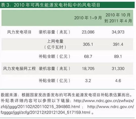 征收的電價附加能否滿足可再生能源電力補貼的需求呢?我們參照發(fā)改委發(fā)布的數(shù)據(jù)【4】來看。根據(jù)表2顯示,電價附加的主要補貼對象是可再生能源發(fā)電項目,接網(wǎng)費用占比很小,約為4.2%。在可再生能源發(fā)電項目中占比最多的是風電,因為在2010年,太陽能發(fā)電項目還非常少。依據(jù)表3,2010年1月-2011年4月,上網(wǎng)風電發(fā)電量達到696.5億千瓦時,補貼金額為157.8億元,占到同期可再生能源發(fā)電項目補貼額198.4億元的80%。