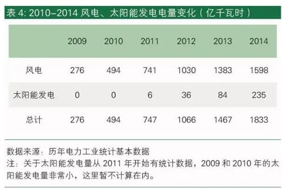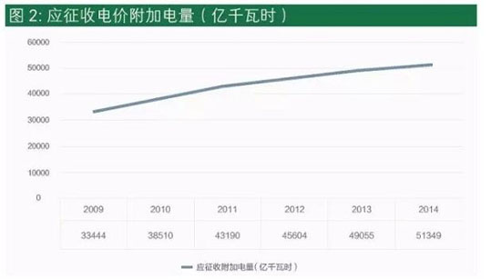 加速提升的電價附加征收標準反映出中國可再生能源發(fā)電的快速發(fā)展。根據(jù)電力企業(yè)聯(lián)合會的數(shù)據(jù),風電發(fā)電量從2009年的276億千瓦時,增加到2014年的1598億千瓦時,五年時間增長接近五倍。