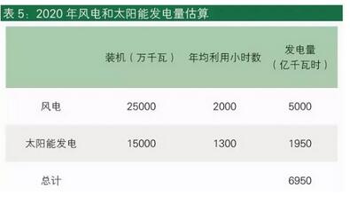 我們假設(shè)2020年中國能夠?qū)崿F(xiàn)風電和太陽能發(fā)展目標,如表5所示,那么二者加起來的發(fā)電量可以達到6950億千瓦時,比2014年的水平增加了280%。假設(shè)2020年的補貼額在2014年570億元的水平上也增加280%,將達到2161億元。
