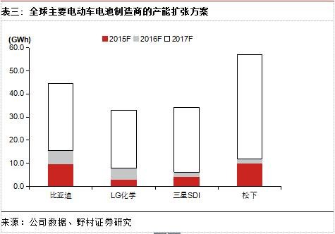 同時,我們注意到電池廠商還需要不斷擴大產能,以獲得成本優勢,這也與半導體行業情況類似。比亞迪目前擁有世界上最大的電動汽車的電池容量,2016年底之前實現15.9千兆瓦時。但松下和特斯拉的超級電池工廠(GigaFactory)將生產35千兆瓦時。2016-2020 財年,我們認為大部分產能擴張將來自比亞迪、松下、LG化學和三星SDI等主要電動汽車生產商。