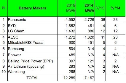 此外,中國還有幾位實力型選手也進入前十排行,比如北京普萊德(Beijing Pride Bower)、洛陽Air Lithium(就是給康迪電動車提供心臟的公司)已及萬向集團分列2015年排行榜的8、9、10位。