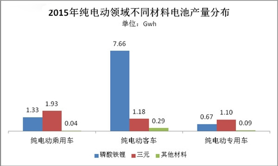 根據不同電池材料看,2015年磷酸鐵鋰電池出貨量達10.86Gwh,占據市場近69%份額;對應三元材料電池出貨量為4.26Gwh,占比27%;而對應錳酸鋰、鈦酸鋰、超級電容、鎳氫電池等其他材料電池出貨量僅0.6Gwh,占比4%。