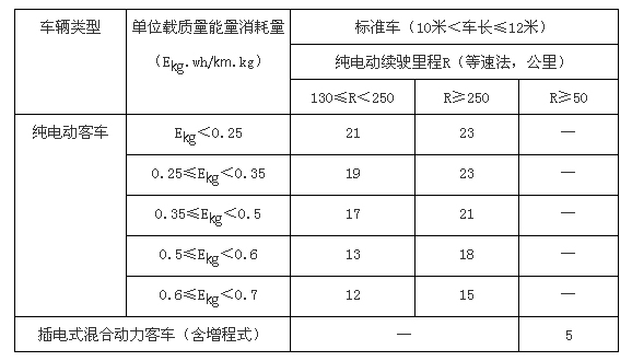 二、純電動、插電式混合動力等客車推廣應用補助標準(單位:萬元/輛)