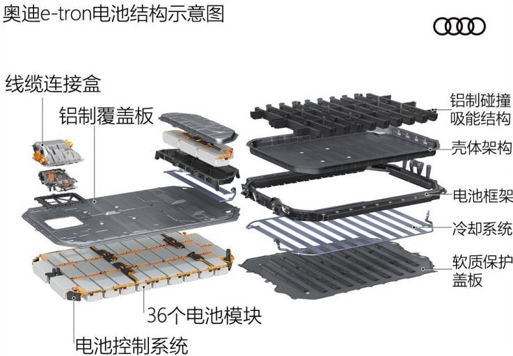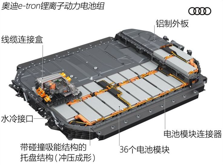 據(jù)此前報道,奧迪E-Tron的電池系統(tǒng)長2.28米,寬1.63米,高34厘米,共包括36個電池模組(每個模組由12個60Ah的電芯組成,電芯由LG化學提供),電池組容量為95kWh,車輛工況續(xù)航里程400公里。